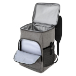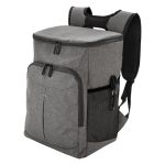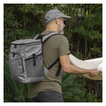Mochila cooler. Compartimento principal con cierre en la parte superior. Compartimento frontal con cierre. Dos bolsillos laterales de red multipropósito. Incluye llavero destapador de botellas de aluminio (5,5 x 1,1 cm) extraíble. Correas regulables acolchadas y reforzadas. Cierres metálicos. Tiradores de cierre metálicos de color negro.